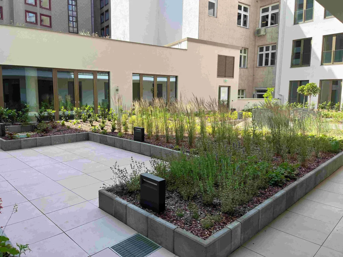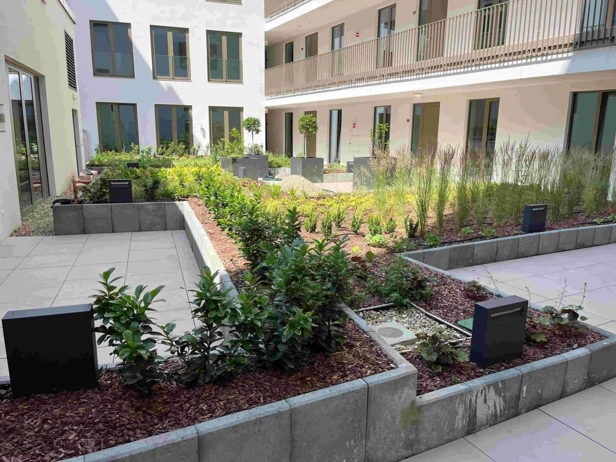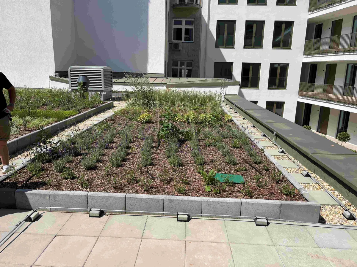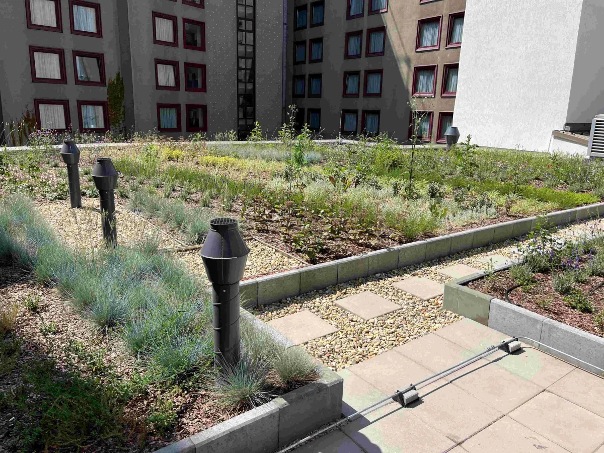 Elvégzett munkák: Tetőkert építés, növény ültetés, beton szögtámfal, szórt és lapburkolat, öntözőrendszer