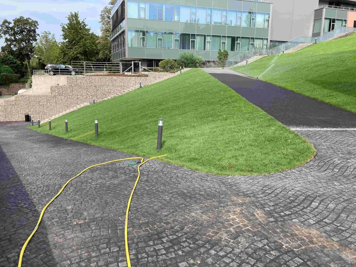 Rendszeres nyírással, gyepszellőztetéssel, gyomirtással és tápanyagpótlással tartjuk karban a füves területeket. Célunk az egységes, sűrű és élénkzöld gyepfelület kialakítása és fenntartása.